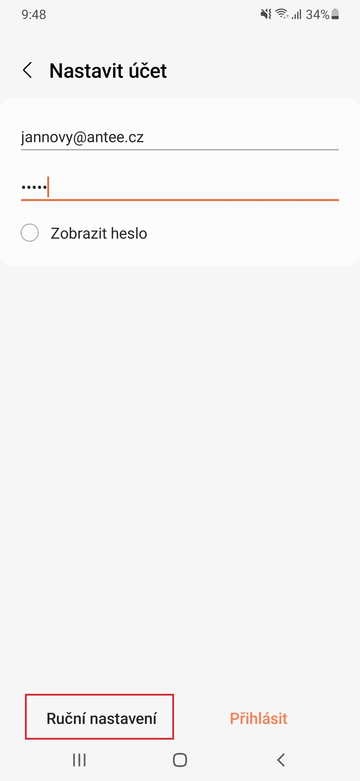 3) Vyplňte svůj e-mail a heslo, dále klikněte na možnost Ruční nastavení.