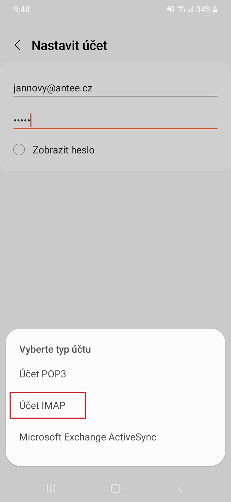 4) Zde můžete vybrat mezi typem účtu. Zvolte IMAP.