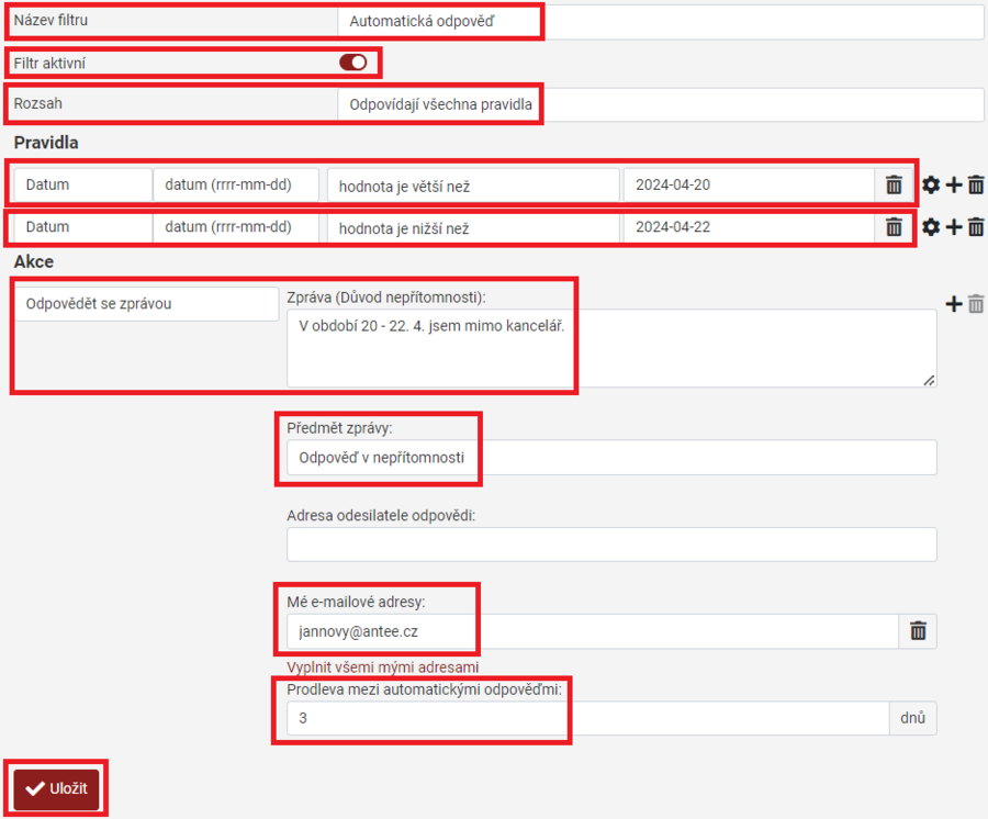 6) Filtr aktivní: musí být zaškrtnuto jinak odpověď nebude fungovat.