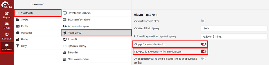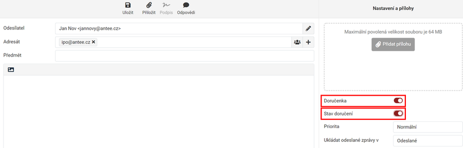 Toto nastavení je vhodné použít, pokud chcete mít jistotu, zda e-mail dorazil k adresátovi Stav doručení nebo pokud chcete být informováni o tom, že si adresát vaši zprávu otevřel/přečetl Doručenka. Tyto dvě možnosti nastavíte ve chvíli, kdy píšete novou nebo odpovídáte na přijatou zprávu nebo v nastavení.