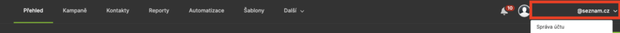 Po registraci se dostanete automaticky na stránku „Přehled účtu“, zde v pravém horním rohu stránky klikněte na váš e-mail a v rozbalovacím menu vyberte možnost „Správa účtu“.