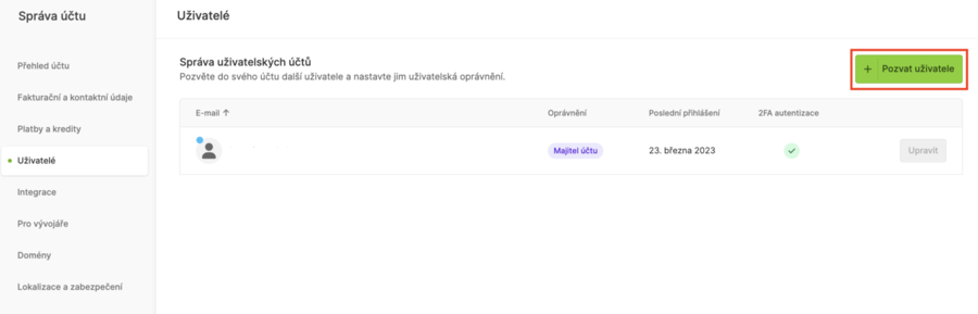 Na stránce „Správa účtu“ vyberte kategorii „Uživatelé“ a klikněte na zelené tlačítko s pluskem „Pozvat uživatele“.