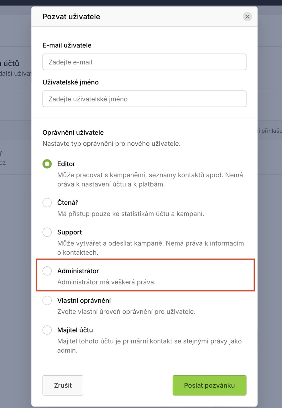 Zobrazí se formulář „Pozvat uživatele“, zde vyplňte e-mail onlinemarketingantee@gmail.com, zvolte možnost „Administrátor“ a klikněte na „Poslat pozvánku“.