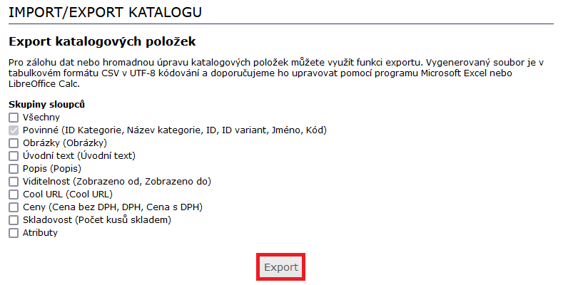 Vygenerovaný soubor je ve formátu .csv s použitým kódováním UTF-8. O jeho úpravě se můžete dočíst zde.