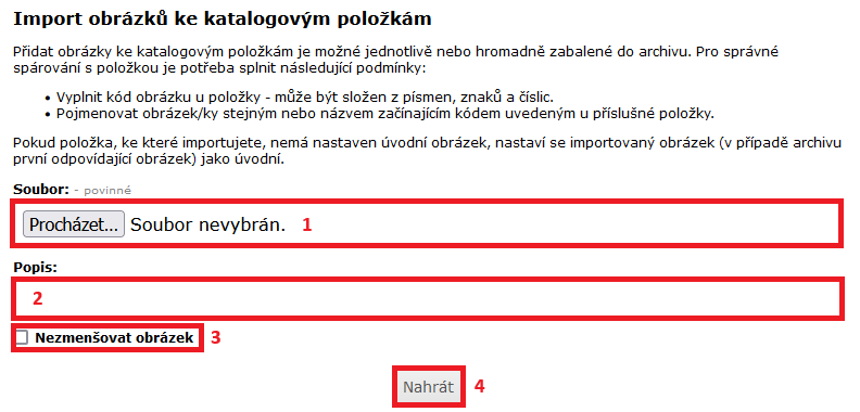 Hromadně můžete ke katalogovým položkám nahrát obrázky. Stačí když se budou názvy obrázků shodovat s položkou .csv souboru obrázky (při celkovém exportu se jedná o sloupec G). Více obrázků u jednoho produktu můžete oddělit pomocí svislé čáry „obrázek1|obrázek2“.