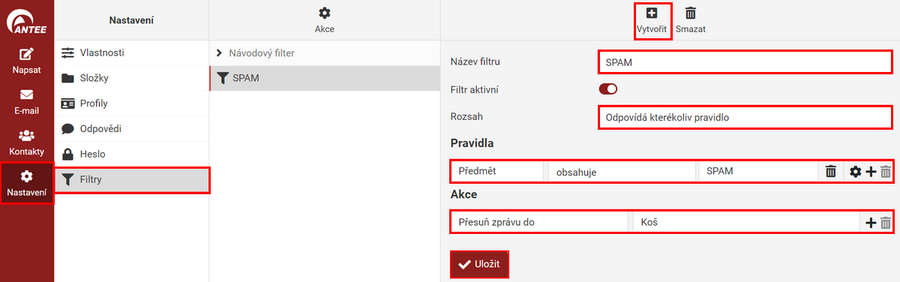 Filtry slouží k tomu, aby se příchozí e-maily filtrovaly dle nastavených pravidel. Příkladem takového filtru může být: Chci, aby každá zpráva s předmětem SUPER NABÍDKA se automaticky přesouvala do složky SPAM. Pomocí filtru můžete nastavit i přeposílání e-mailů, návod je zde.