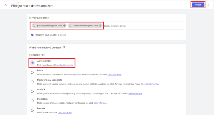 Na následující stránce můžete zvolit uživatelské oprávnění pro nového uživatele. Pro správu účtu doporučujeme zvolit úroveň „Administrátor“. Zde, prosím, přidejte naši e-mailovou adresu pristupyantee@gmail.com a analytikantee@gmail.com . Zaškrtněte možnost „upozornit tohoto uživatele e-mailem“ a potvrďte kliknutím na tlačítko „Přidat“.