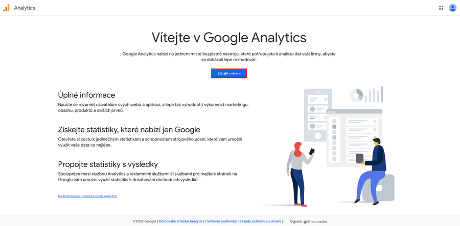 Na stránce Google Analytics (http://www.google.com/analytics/) se přihlaste kliknutím na Zahájit měření.