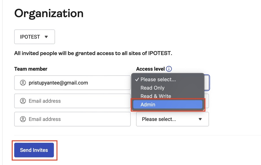 Vyplňte e-maily pristupyantee@gmail.com a analytikantee@gmail.com a u obou vyberte „Access level“ na úroveň „Admin“. Poté už stačí stisknout modré tlačítko „Send invites“ a je hotovo.