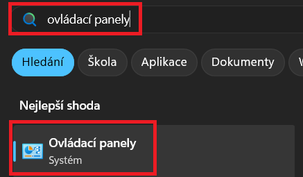 2) V nabídce start vyhledejte Ovládací panely a klikněte na ně.