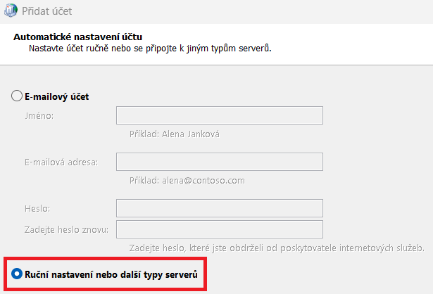 8) Vyberte Ruční nastavení nebo další typy serverů. Klikněte na Další.