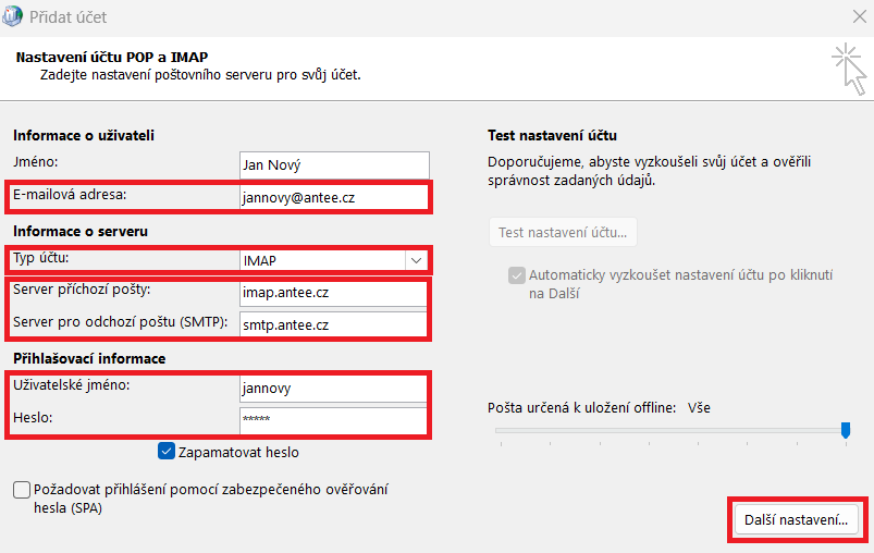 10) Vyplňte všechny údaje dle zaslaného infoletáku. Klikněte na Další nastavení....