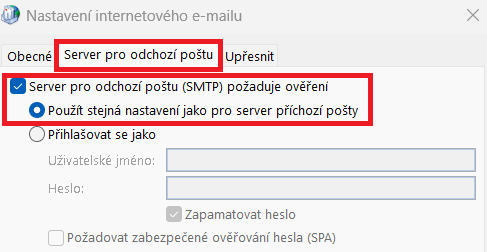 11) Přejděte na záložku Server pro odchozí poštu a zaškrtněte Server pro odchozí poštu (SMTP) požaduje ověření a ponechte Použít stejná nastavení jako pro server příchozí pošty.