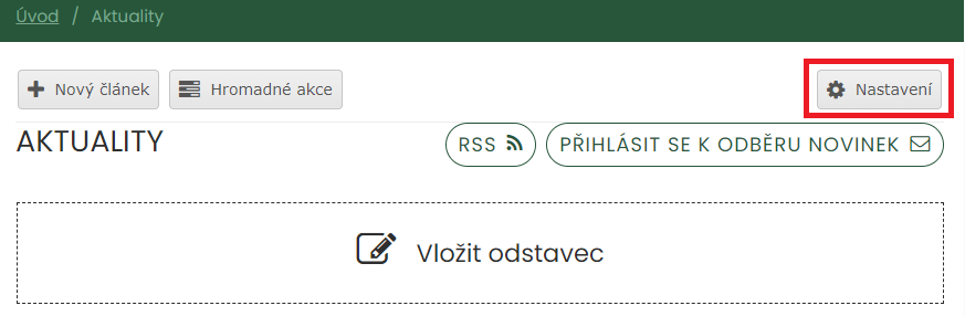 Přidat úvodní text: umožňuje přidat krátký úvodní text k článkům. Úvodní text se zobrazuje v přehledu a text článku v detailu.