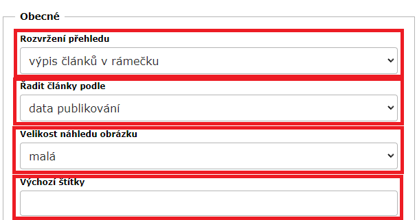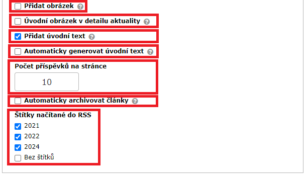 Výchozí štítky:štítek, který se následně bude automaticky předepisovat do pole Štítky, při každém vytváření nové aktuality.
