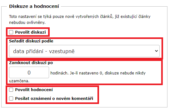 Povolit diskuzi: zapnutím této možnosti umožníte uživatelům psát pod daný článek komentáře.