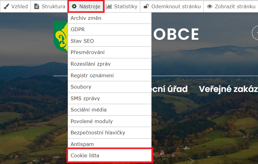 2) Na vrchní nástrojové liště vyberte Nástroje - Cookie lišta.
