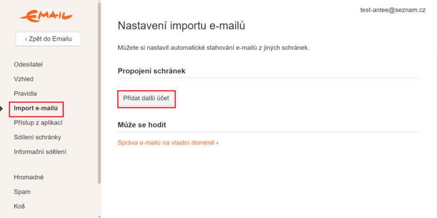 4) Z nabídky vyberte Import e-mailů následně se vám zobrazí Nastavení importu e-mailů.