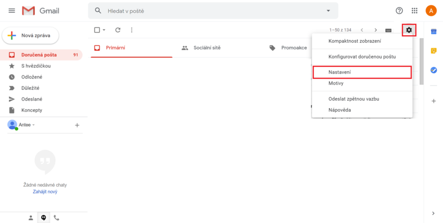 2) Klikněte na ozubené kolečko v pravém horním rohu.