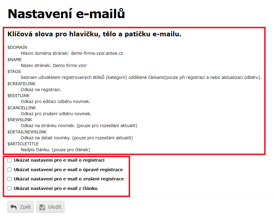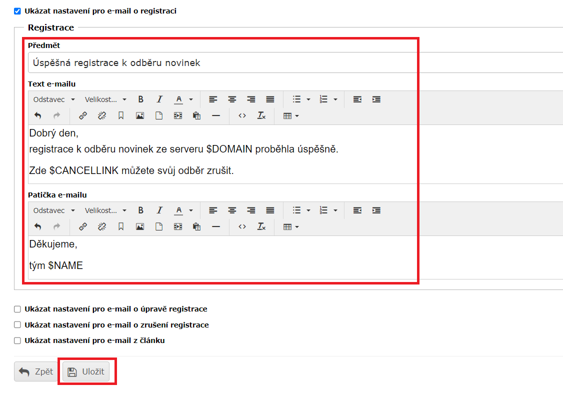 - Klíčová slova: Při odeslání emailu budou nahrazena. Např. $NAME bude v emailu nahrazeno za název vašich stránek.