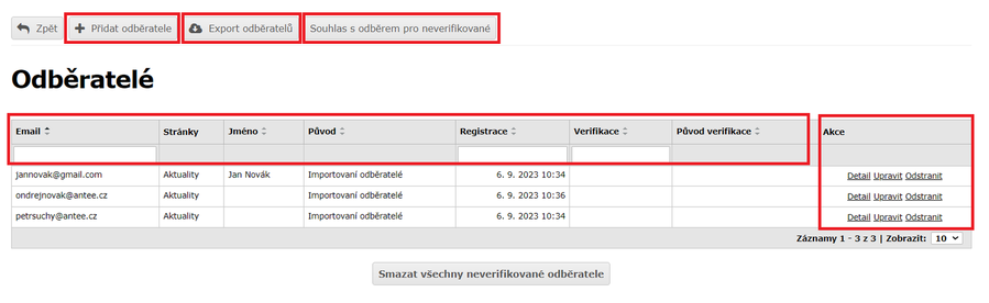 - Akce: Zde si můžete zobrazit detail, upravovat či odebírat odběratelé.