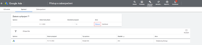 3. Dáme vám vědět, že jsme váš účet propojili s naším agenturním. Následně je potřeba již jen odsouhlasit udělení přístupu. POZOR - na potvrzení žádosti máte jen omezenou lhůtu.