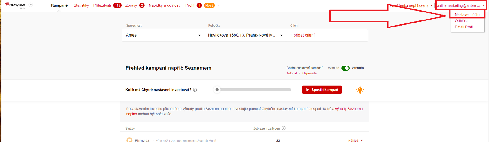 - Vpravo nahoře klikněte na červenou šipku a následně na „Nastavení účtu“.