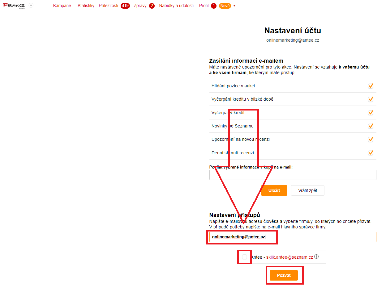 - V sekci „Nastavení přístupů“ zadejte e-mail onlinemarketing@antee.cz, vyberte firmu, do které chcete přístup udělit a klikněte na tlačítko „Pozvat“.