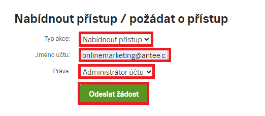V sekci Nabídnout přístup / požádat o přístup vepište do kolonky jméno účtu e-mail onlinemarketing@antee.cz.