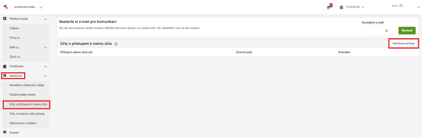 - V levém bočním panelu kliknutím rozbalíte menu „Nastavení“. Kliknete na „Účty s přístupem k mému účtu“.