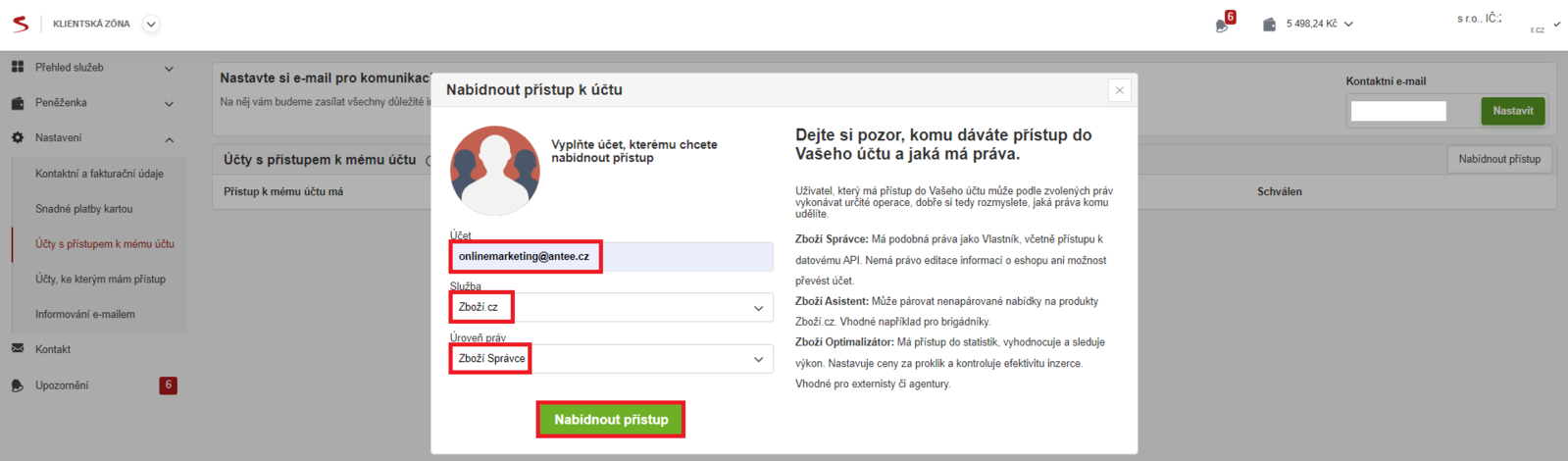 - V pravé horní části najdete tlačítko „Nabídnout přístup“, po kliknutí na něj se otevře obrazovka s „Nabídnout přístup k účtu“. Do pole „Účet“ napište onlinemarketing@antee.cz. Vyberte službu „Zboží.cz“, Úroveň práv „Správce“. Po vyplnění údajů klikněte na „Nabídnout přístup“.