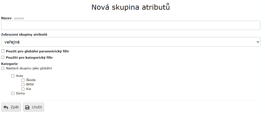 - Kategorie - Tuto skupinu atributů bude možné nastavit u produktů spadajících do zaškrtlé kategorie