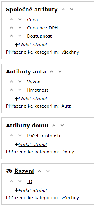 - Zobrazení skupiny atributů - veřejné atributy vidí zákazník, interní slouží pouze pro vás (nejčastěji se používá pro řazení)
