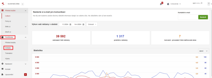 - V levém bočním panelu kliknutím rozbalíte menu „Peněženky“. Kliknete na „Doklady“.