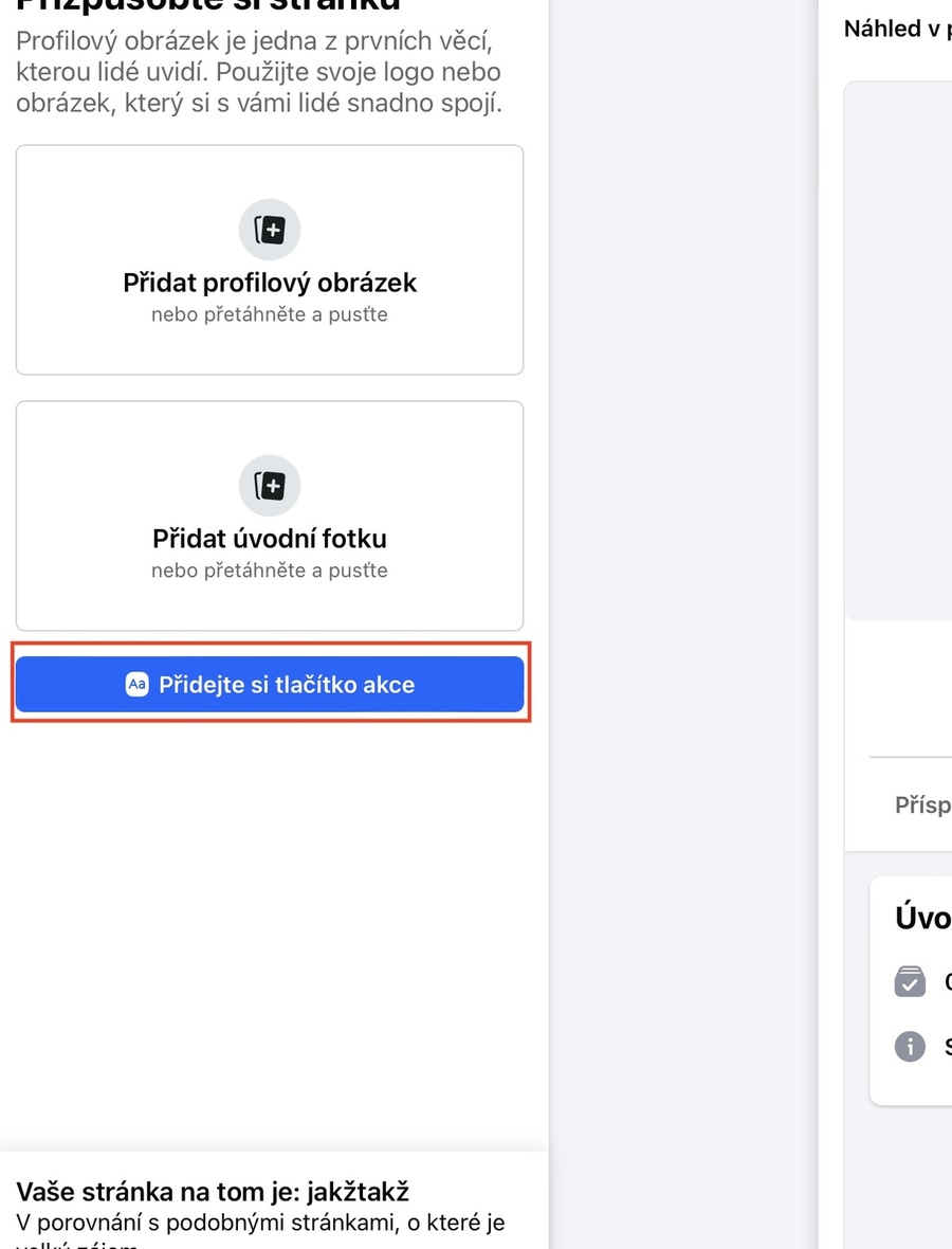 - Další krok je nahrání profilové a úvodní fotografie. Zde si můžete navolit funkci tlačítka akce. Zde máte několik možností, co může tlačítko dělat, například „Objednat“ pro otevření webu restaurace, „Poslat zprávu“, kdy návštěvníka tlačítko přesměruje do konverzace na Messengeru a může vás tímto způsobem rovnou kontaktovat, nebo „Zhlédnout“ pro zobrazení webu s vaším videem.