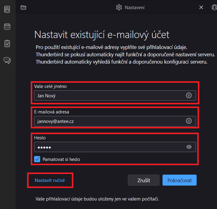 4) Vyplňte pole vaše jméno (libovolné), E-mailová adresa a Heslo. Po vyplnění těchto údajů klikněte na Nastavit ručně.