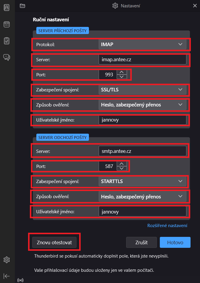 6) Po vyplnění těchto údajů klikněte na Otestovat.