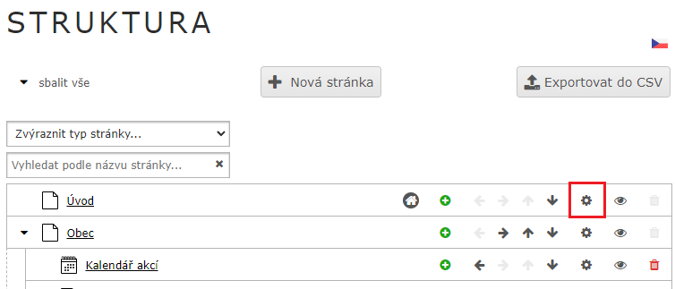 3) Klikněte na požadovanou stránku levým tlačítkem myši a vyberte VLASTNOSTI (ozubené kolečko).