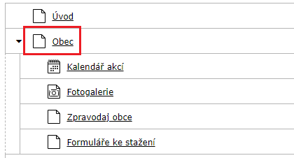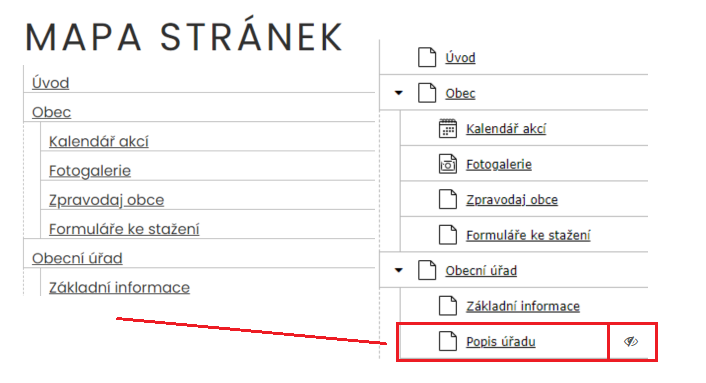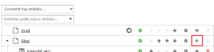 Stránka se nebude zobrazovat v menu. Přístup k ní bude možný pouze přes editaci stránek. Stránka jde skrýt i ve struktuře, po kliknutí na „oko“.