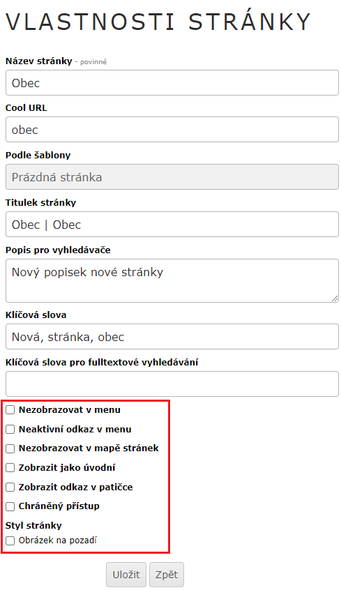 4) V novém okně se zobrazí výše uvedené vlastnosti stránky. Pro jejich změnu přepište textové pole či za(od)škrtněte checkbox. Položka šablona jako jediná nelze změnit. Pro změnu šablony je potřeba vytvořit zcela novou stránku (více v návodu zde)