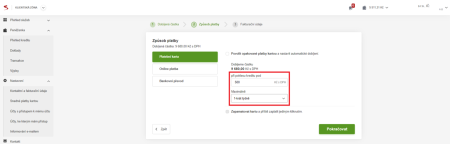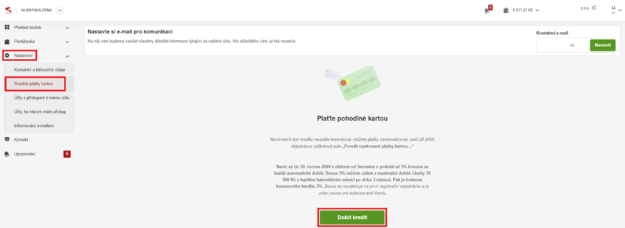- V levém bočním panelu kliknutím rozbalíte menu „Nastavení“. Kliknete na „Snadné platby kartou“. Zobrazí se obrazovka s kreditní kartou, klikněte na „Dobít kredit“.