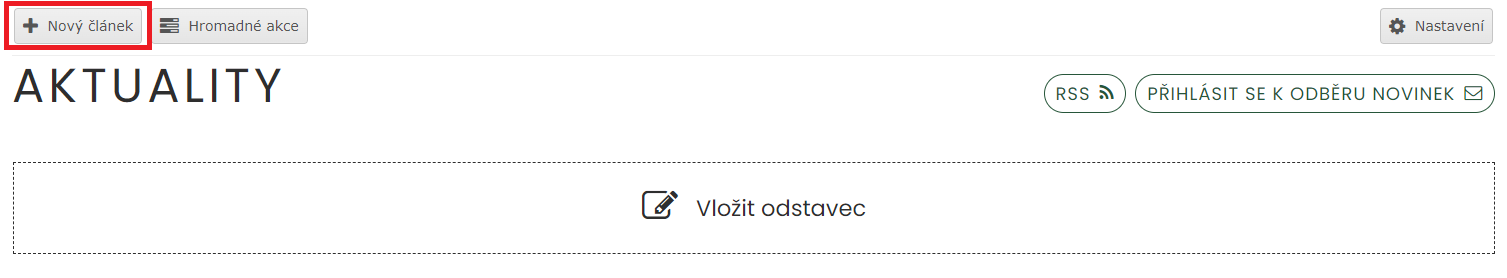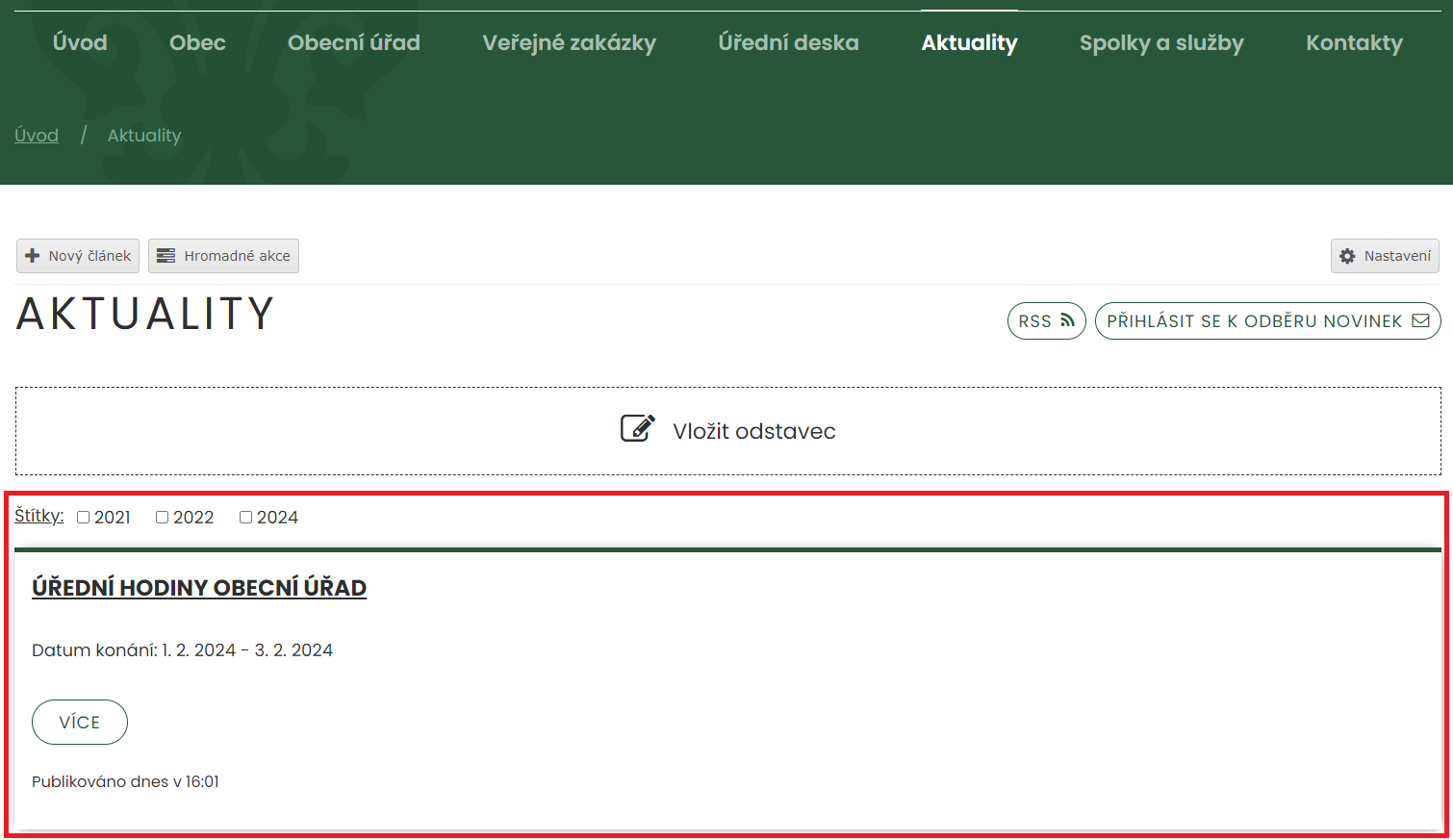 5) Po uložení se nově vytvořený článek zobrazí v přehledu všech článků v aktualitách.