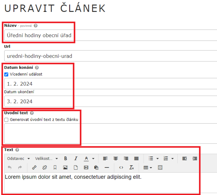 4) Po kliknutí na tlačítko Nový článek se zobrazí nová stránka, kde je možnost vyplnit jednotlivá pole, např. název, datum konání, úvodní text, text...:
