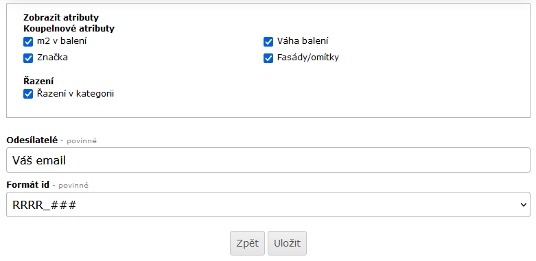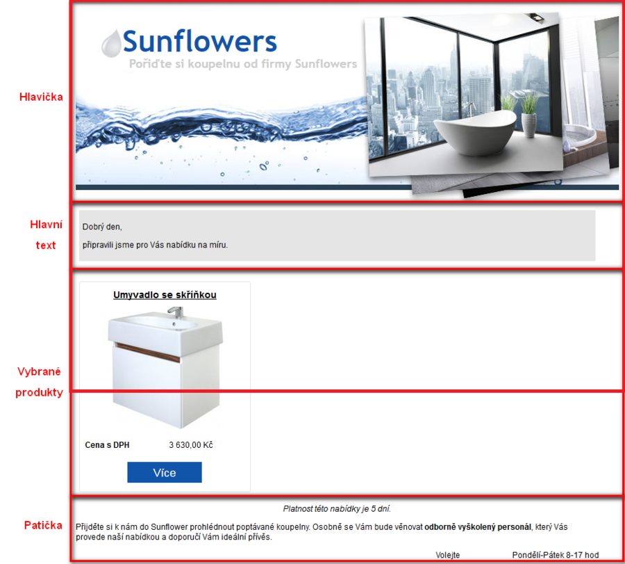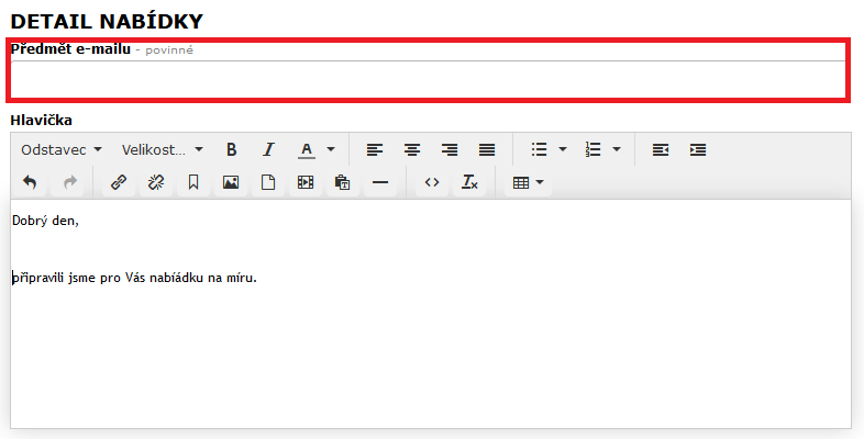Zde už vidíme námi zvolenou hlavičku a patičku. V této části doplníme poslední vyznačená pole jako je Předmět e-mailu a Hlavní text určený přímo pro námi zvoleného klienta. Také se nám zde ukazují produkty a jejich atributy. Můžeme tu i odebírat produkty pomocí modrých tlačítek se znaménkem mínus.