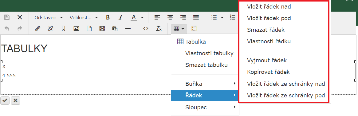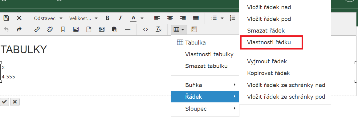 Než byste upravovali každou buňku v jednom řádku zvlášť, můžete použít úpravy celého řádku najednou. Možnosti jsou přidání nového řádku (před/za označený řádek), smazání řádku, vlastnosti řádku nebo kopírování/vyjímání a následné vkládání řádku ze schránky.