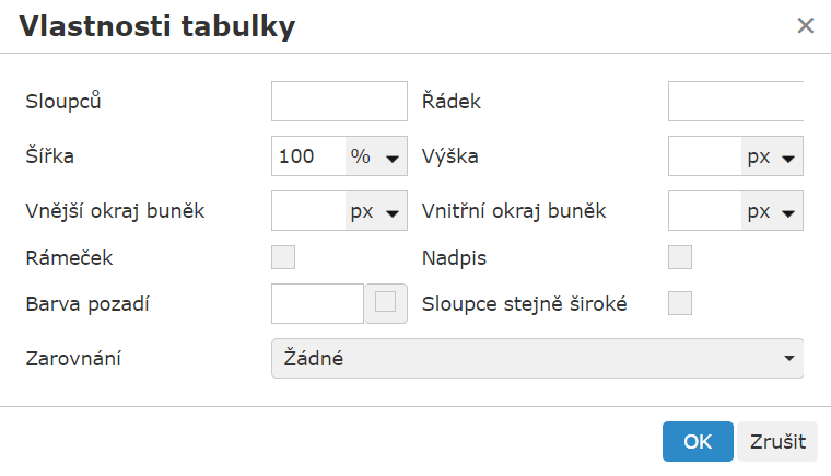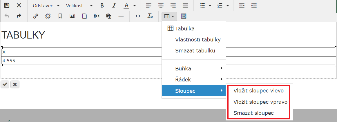 Úprava sloupců nabízí pouze vložení nového sloupce vlevo/vpravo od označeného, či smazání označeného sloupce.
