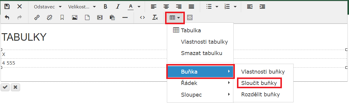 2) Klikněte na ikonku Tabulky, Buňka a Sloučit buňky.