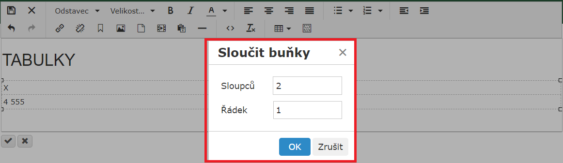 Vyberte, kolik sloupců (doprava od současné buňky) a kolik řádků (dolů od současné buňky), se má spojit. Následně potvrďte sloučení kliknutím na OK.
