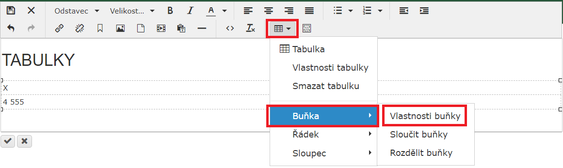 2) Klikněte na Tabulky, Buňka a Vlastnosti buňky.