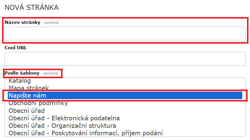 4) Název stránky může být libovolný. Jako šablonu vyberte Napište nám.